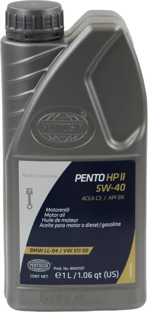 Pentosin 5W-40 HP II Synthetic Motor Oil exceeds service class API SM/CF, ACEA A3/B3/B4/C3, AVW 502.00, 505.00, 505.01, BMW LL-04, MB 229.51, POR A40, FOR WSS-M2C917-A