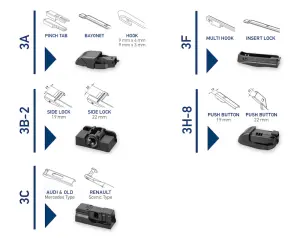 | Wiper Blade Connection Type | Hook, Bayonet, Pinch Tab, Side Lock, Push Button, Insert Lock, Multi Lock, Renault Scenic Type, Audi & Old Mercedes Type |