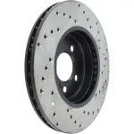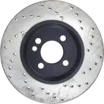 - Description: StopTech Drilled Sport Rotors are 1-piece direct replacement brake discs for factory brake systems and stock calipers that look great behind your wheels – and offer significantly improved braking performance. The unique cross-drilling aids with heat and brake dust dispersal; prevents glazing of the pads; adds bite and improves wet and dry braking performance. Built to last; the black e-coating provides protection from corrosion and the high carbon metallurgy (in most applications) offers quieter operation; better crack resistance and increased performance.