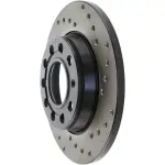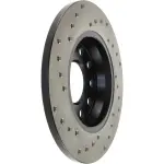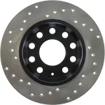 - Description: StopTech Drilled Sport Rotors are 1-piece direct replacement brake discs for factory brake systems and stock calipers that look great behind your wheels – and offer significantly improved braking performance. The unique cross-drilling aids with heat and brake dust dispersal; prevents glazing of the pads; adds bite and improves wet and dry braking performance. Built to last; the black e-coating provides protection from corrosion and the high carbon metallurgy (in most applications) offers quieter operation; better crack resistance and increased performance.