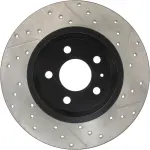 - Description: StopTech Drilled and Slotted Sport Rotors are 1-piece direct replacement brake discs for factory brake systems and stock calipers that look great behind your wheels – and offer significantly improved braking performance. The unique cross-drilling and slotting aids with heat and brake dust dispersal; prevents glazing of the pads; adds bite and improves wet and dry braking performance. Built to last; the black e-coating provides protection from corrosion and the high carbon metallurgy (in most applications) offers quieter operation; better crack resistance and increased performance.